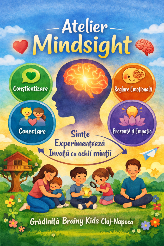 Atelierul Mindsight părinte–copil, organizat la Grădinița Brainy Kids,Cluj-Napoca, este o invitație la conștientizare, reflecție și învățare autentică. Este un spațiu în care părinții,copii și educatorii descoperă cum emoțiile modelează relațiile și cum, prin prezență și empatie, putem construi legături sănătoase și echilibrate încă din primii ani de viață.