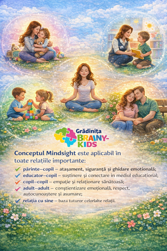 Conceptul Mindsight este aplicabil în toate relațiile importante: – părinte–copil – atașament, siguranță și ghidare emoțională; – educator–copil – susținere și conectare în mediul educațional; – copil–copil – empatie și relaționare sănătoasă; – adult–adult – conștientizare emoțională, respect, autocunoaștere și asumare; – relația cu sine – baza tuturor celorlalte relații.