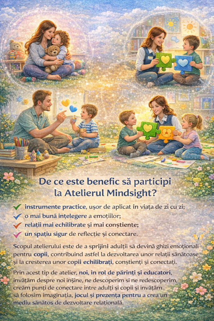 Atelierul Mindsight părinte–copil oferă părinților și educatorilor: – instrumente practice, ușor de aplicat în viața de zi cu zi; – o mai bună înțelegere a emoțiilor; – relații mai echilibrate și mai conștiente; – un spațiu sigur de reflecție și conectare.